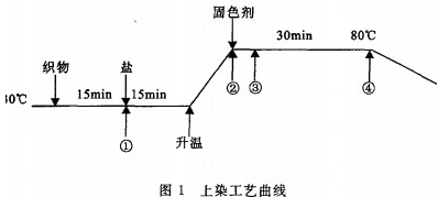 (1)染色工藝工藝處方:染料1%(o.w.f.),促染劑zg/L,碳酸鈉10g/L,上染溫度X時間:3O℃×30min,固色溫度×時間:80"CX60min,浴比10:1.上染工藝曲線如圖1.圖1中①②③④為取樣點.