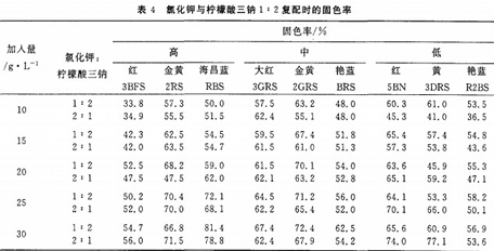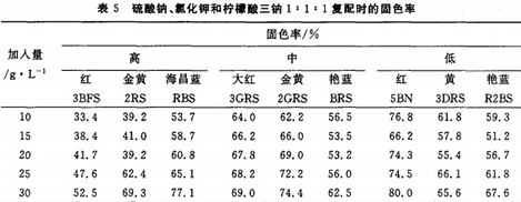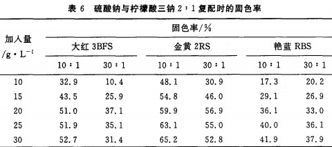 2.4硫酸鈉、氯化鉀和檸檬酸三鈉以1:1:1復配時對固色率的影響