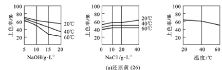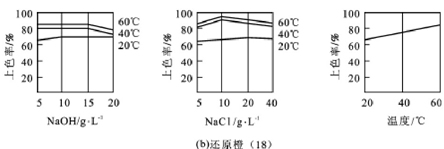 (3)丙法組的還原黃(26)、還原橙(1)和還原紅(46)的上色率和堿濃度、鹽量和溫度的關系如圖5-3所示。