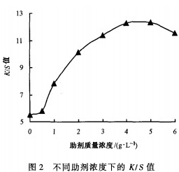 分散紅玉S-5BL質量濃度為2Og/L,助劑CWL質量濃度為0~6g/L,180℃對滌綸機織布進行熱溶染色(低溫染色),測得染色結果如圖2所示。