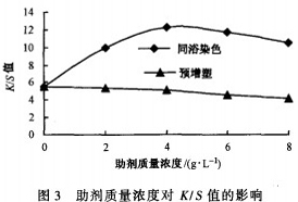 由圖3可知,180℃低溫染色時,同浴熱溶染色工藝的K/S值隨著助劑濃度的增加呈上升趨勢,預增塑工藝的K/S值隨著助劑濃度的增加呈下降趨勢。說明助劑CWL不適合用于預增塑工藝。其原因可能是:已經浸軋并烘干在織物上的助劑CWL在浸軋染液時,由于濃度差又溶落在染液中,使其對織物的增塑作用減??;另外由于溶落在染液中的助劑對分散染料有親和力,可能對染液中的分散染料上染起到牽制作用,減少了分散染料對織物的上染趨勢,導致預增塑工藝得色反而低。