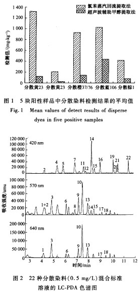 將5塊陽性樣品(其中2塊樣品都含有分散黃23)分別用氯苯蒸汽回流法和DIN54231的超聲法處理,提取液用LC-PDA定量分析,并對l0次平行測試結果進行統計分析,結果見圖1。圖中顯示,經氯苯蒸汽回流提取后,樣品中分散染料的檢測值為超聲提取結果的2.3~11倍,表明本文方法提取效率更高。此外,本文方法的平行測試結果的相對標準偏差值(RSD)都小于10%,而超聲法的RSD值較高,達17.8%~28.4%。這可能是由于在超聲容器中超聲能量分布不均勻所致,因此,相比較DIN54231規定的超聲波輔助甲醇提取方法,本文研究的氯苯蒸汽回流提取方法更穩定,提取效率更高。