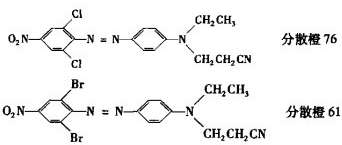 (3)復配型染料中有致敏性分散染料,最負盛名的如分散黑EX2SF300%是由C.I.分散橙76、紫93及藍291復配而成,因此必須另找復配處方來代替C.I.分散橙76。很多染料廠采用C.I.分散橙61來代替分散橙,兩者化學結構相近:
