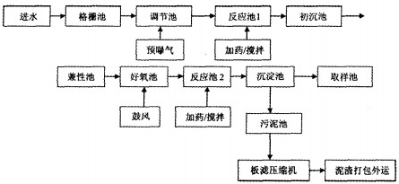 污水經格柵隔去粗大的懸浮物,然后經格網濾去細小懸浮物,廢水流人調節池均化、緩沖水質水量。在調節池中加曝氣設施,充分曝氣混合.然后進人絮凝沉淀池,經絮凝沉淀可除去一部分的懸浮物,色度和CODer,絮凝后廢水由污水提升泵打人兼性池,兼性池培養大量的兼性細菌,附著在填料上,利用兼性細菌水解和產酸作用,將污水中難降解的大分子有機物轉化為易降解的小分子有機物,不溶性的有機物變成溶解性的有機物,提高廢水的可生化性。然后流人好氧池,好氧池中的生物填料上附著有大量好氧菌,在曝氣充氧的條件下,將廢水中有機物分解成無機物。廢水中死亡脫落的細菌、SS隨廢水流人反應池,同時加人藥劑進行物化反應,加人混凝劑將廢水中小顆粒的懸浮物凝結成大顆粒易沉絮凝體。經過反應后的廢水流人沉淀池進行固液分離,底部污泥進人污泥池進行濃縮,池底污泥經泵打人脫水機,脫水后的污泥摻人燃煤燃燒.濾液回調節池。沉淀池上部清水流人清水池排放。