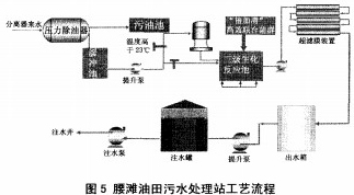 和懸浮物含量幾乎為零。通過膜截留后的濃縮液回流至微生物反應池(使有效菌液保留在微生物反應池內)。第三,整個工藝不需再投加絮凝劑和殺菌劑等藥劑,使得油藏的水不再因為投加了各種藥劑而變得越來越復雜。該工藝處理后污水水質達到低滲油田回注A1級水質標準,可為注水站提供優(yōu)質穩(wěn)定的回注水。腰灘油田微生物+膜污水處理工藝流程如圖5。