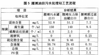 采油廠地質研究所的腰灘油田污水處理水質分析報告數(shù)據(jù)顯示微生物+膜污水處理系統(tǒng)能夠較好的凈化污水。壓力除油器出口含油為29.45mg/L,經過污水系統(tǒng)處理后含油量僅為0.3lmg/L;硫化物含量為9.46mg/L,處理后不含硫化物;硫酸鹽還原菌為2.5個/m2,處理后不含硫酸鹽還原菌;腐生菌為140個/ml,處理后為9.5個/ml;固體含量51.2mg/L,處理后為7.2mg/L(表5)。該系統(tǒng)能較好的處理含油、硫化物、菌類和固化物等物質。