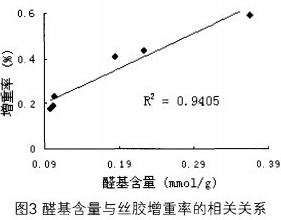 2.3氧化棉纖維的醛基含量與絲膠處理后增重率的關系