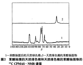 由圖1可以看出,天然綠色棉在δ=33處有一個峰,據(jù)分析可能是一CHz一基團,認為是天然綠色棉中大量的蠟質和脂肪的結構.將天然綠色棉用苯醇溶液抽提去掉蠟質和脂肪.苯醇抽提過的天然綠色棉和苯醇抽出物進行固體核磁共振波譜分析,見圖2.