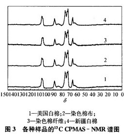 美國白棉、各種染色棉布、各種染色棉纖維的nCCPMAS—NMR譜圖均與圖1中新疆白棉的一致,如圖3所示.