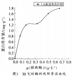 圖1是酸性纖維素酶SHL在30℃下的吸附等溫曲線由該圖可以看出隨著體系中游離酶質量濃度的增加.酶在織物上的吸附量增大當游離酶的質量濃度在0.2~0.3g/L時,織物表而酶的吸附量兒乎與游離酶的濃度無關當體系中游離酶的質量濃度超過0.3g/L時.纖維素酶在織物表而的吸附量義開始增加.由此可以認為.纖維素酶在纖維表面的吸附是多分子層吸附。