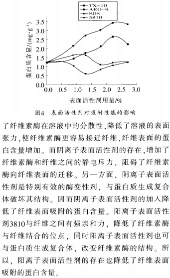 (4)非離子表面活性劑促進了酶在織物表面的吸附,而陰離子和陽離子表面活性劑降低了織物表面的蛋白質含量。