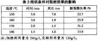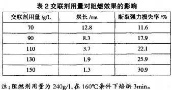 從表2可以看出,隨著交聯劑用量的增加,阻燃效果加強,但考慮到斷裂強力損失情況,教交聯劑用量應該選擇在130g/L為佳。