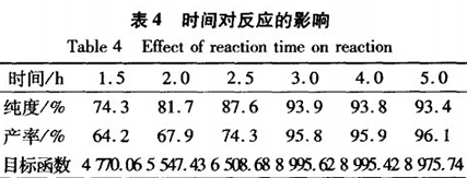 由表4中看出,隨著反應時間的延長,產率和產品純度逐步增加,當反應時間達到3h后,產品的產率增加,而產品純度有所下降,原因可能是較長時間的受熱使得副反應增多導致純度下降。在實際應用中,可根據對純度和產率的具體要求選擇合適的反應時間。本實驗以純度和產率的乘積為目標函數,以反應時間為變量,得到最佳反應時間應為3h,即反應時間為3h時,純度可達93.8%,回收率為95.8%。