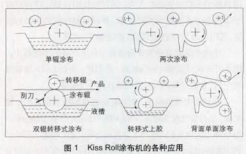 涂層設備主要有KissRoll(吻油輥)型涂布設備、泡沫涂層設備等。其中KissRoll型涂布機是一種用途廣泛的涂布設備,除了單輥的基本型外,還衍生出多種不同用途的機型。因此,能適應不同黏度、不同速度、不同施加量的產品處理(圖1)。