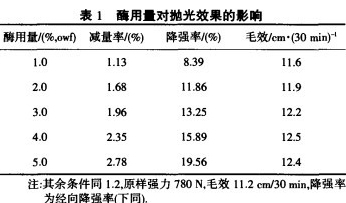 減量率:將纖維素酶處理前后的試樣在烘箱中105℃烘干至質量恒定,按公式計算減量率;斷裂強力:按GB/T3923—1997測定;毛效:測量蒸餾水(含0.5%重鉻酸鉀)在30min內沿織物(經25cm,緯4cm)所上升的高度;懸垂系數:在懸垂測試儀上測定,織物懸垂系數的計算公式F=(G2一G3)/(G1一G3)x100%.式中,G1為與試樣相同大小紙的質量,mg;G2為與試樣投影圖相同大小紙的質量,mg;G3為與夾持盤相同大小紙的質量,mg.