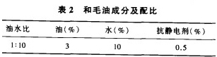 積極調(diào)整和毛工藝,選用合理的和毛助劑及混用比例,既要保證可紡性,又要兼顧成紗效果。和毛過程中,先對新型復(fù)合纖維進行開松,再進一步與兔羊絨纖維進行混合。由于兔羊絨的吸濕性強、縮絨性好,如果直接加油,兔羊絨易粘并糾纏,應(yīng)采取間接的給油方式,把和毛油水噴灑在兔羊絨上,悶毛至少24h,使油水均勻滲透,減少梳理時纖維的損傷。兔羊絨的比電阻大、易產(chǎn)生靜電,導(dǎo)致可紡性差,因此在和毛油中可加入一定量的抗靜電劑;兔絨纖維滑爽,纖維之間抱合力差.因此要加適量的防滑劑(增磨劑),以提高纖維的抱合力,提高可紡性。和毛后的上機回潮率夏季必須控制在20%~24%之間,冬季必須控制在22%一26%之間。兔絨含量越高,和毛油用量越大;抗靜電劑的用量也隨著兔絨含量的增加而加大,加水量的多少一般要根據(jù)原料回潮率、車間相對濕度、上機工藝來確定。和毛油成分及配比見表2。