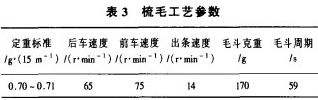 梳毛機是英國TATHAM公司的。由于兔絨光滑,為了避免斷網(wǎng)、粗紗大量斷頭等問題,對梳毛機的速度應(yīng)適當(dāng)降低,以后車錫林轉(zhuǎn)速65r/min為佳。為保證梳理效果,梳毛機的工作輥針布選用應(yīng)盡量細,初梳選用34號針布,末梳選用粗紡最高號35號針布。并在喂毛時均勻添加原料,嚴(yán)格控制喂毛量,回條及時均勻地添加到毛斗內(nèi),以保證毛紗支數(shù)偏差及不勻率在標(biāo)準(zhǔn)范圍內(nèi)。為避免纖維受到損傷,在紡制高比例紗時,車速不宜太快。兔絨含量高時,車速要適當(dāng)減慢,為減少機械式喂毛產(chǎn)生的不勻,落毛不勻應(yīng)采取單位時間里增加喂毛次數(shù),減少喂毛量。適量放大隔距,減少梳理環(huán),由于兔絨輕柔易拉傷,要合理調(diào)整各輥隔距,宜大不宜小。梳毛工藝主要參數(shù)見表3。