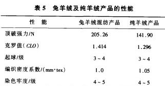 織物的各項性能指標見表5。從表5可見,兔羊絨混紡產品的頂破強度較全羊絨產品的頂破強度大,這主要是使用了新型復合纖維的緣故;兔羊絨混紡產品的克羅值大,這說明該產品的保暖性較好;2種紡織品的起球性和染色牢度相同。