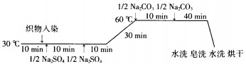 白色純棉織物—染色[染料4%(owf),Na2SO4 60g/L,Na2CO3 20g/L,浴比1:20—皂洗(皂洗劑1g/L,95℃,10min,浴比l:20).工藝曲線如下: