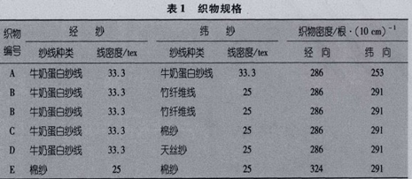 確定織物經緯向緊度:經向g1=60.0%,緯向占w1=54.0%。選擇與牛奶蛋白紗線密度相近的竹纖維紗、棉紗、天絲紗進行交織,并以純牛奶蛋白織物、純棉織物作為性能對比樣本,測試的織物規格數據見表1。織造后對織物進行后整理:燒毛、退漿、煮練、漂白和熱定型等。