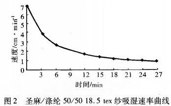 從圖2可看出,在0min~20min時,吸濕速率增量從快到慢,20rain以后,吸濕趨于平衡,吸濕速率的增量趨于0。吸濕的瞬間快速性,說明最終產品具有良好的吸濕性能。