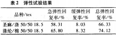 為進一步了解圣麻滌綸混紡紗的物理機械性能,選用了同規格的滌棉混紡紗進行對比,并用Y391型紗線彈性儀對其進行了測試,研究圣麻滌綸混紡紗的彈性。測試結果見表2。