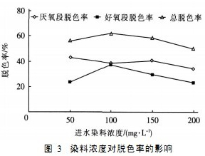 從圖3可以看出,系統(tǒng)對(duì)活性艷藍(lán)KN-R的脫色率隨進(jìn)水染料濃度的增大而先升高后下降,當(dāng)進(jìn)水染料濃度為100mg/L時(shí),脫色率最高(為62%)。在厭氧過程中,脫色率隨進(jìn)水染料濃度的升高而下降,這可能與染料濃度升高導(dǎo)致其生物毒性作用增大有關(guān)。試驗(yàn)中還發(fā)現(xiàn),厭氧段對(duì)COD的去除率隨染料濃度的升高而下降,這也是受染料毒性的影響;系統(tǒng)對(duì)COD的總?cè)コ驶揪S持在90%左右。