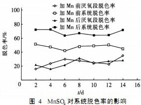 添加微量元素Mn可以提高錳過氧化氫酶(MnP)的活性,從而提高微生物的脫色率,向進(jìn)水中添加7.5mg/L的MnSO4作為增加進(jìn)水中微量元素Mn的手段,考察了對(duì)脫色效果的影響,結(jié)果見圖4。