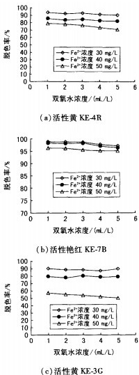 如圖1所示,當Fe2+濃度為30mg/L,H2O2用量1mI/L,反應60min和pH值為3.0時,活性黃KE一4R,活性艷紅KE一7B,活性黃KE-3G,活性紅KE一3B和活性藍KE.R染色廢水脫色率均最高,分別達到93.89%,99.41%,90.24%,98.87%和99.62~70。
