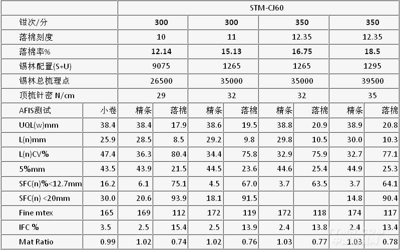 CJ60精梳機(jī) 100%新疆長絨棉不同落棉率 AFIS測試