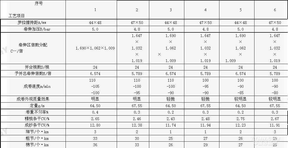生產(chǎn)中在對(duì)成卷質(zhì)量有較大影響的工藝參數(shù),如牽伸區(qū)倍數(shù)的分配、羅拉握持距、加壓力度等各項(xiàng)因素做了對(duì)比試驗(yàn),其成卷質(zhì)量效果見表(1)