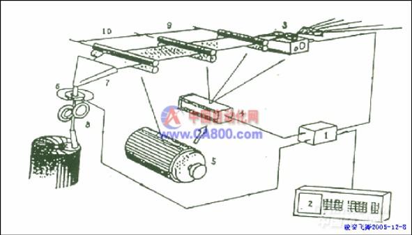該自調(diào)勻整系統(tǒng)是開環(huán)控制系統(tǒng),圖中喂人紗條的粗細(xì)由凹凸羅拉3檢測,紗條粗細(xì)的變化通過高精度的位移傳感器將位移變化量轉(zhuǎn)變?yōu)殡娦盘?,輸入模塊1,在計(jì)算機(jī)中與標(biāo)準(zhǔn)值(設(shè)定值)比較,然后計(jì)算出差值,并存儲下來,當(dāng)被檢測的紗條到達(dá)變速點(diǎn)時(shí),模塊1發(fā)出信號,使伺服電機(jī)5的轉(zhuǎn)速發(fā)生變化,從而改變二羅拉的轉(zhuǎn)速,進(jìn)而改變主牽伸區(qū)10的牽伸倍數(shù),修正喂入紗條的偏差,使輸出紗條達(dá)到均勻的目的。