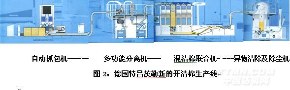 2、沒有性能好的設(shè)備是不可能生產(chǎn)出好的產(chǎn)品來的。21世紀(jì)以來世界的開清棉技術(shù)又有了新的進(jìn)步,以德國(guó)特呂茨勒公司的開清棉流程為例,以往德國(guó)特呂茨勒公司的開清棉流程20世紀(jì)是全自動(dòng)抓包機(jī)—-雙軸流開棉機(jī)—-多倉(cāng)混棉機(jī)機(jī)—-精細(xì)清棉機(jī)—-雙棉箱給棉機(jī)—-梳棉機(jī)等,另外還有金屬探測(cè)儀、異纖清除機(jī)及微除塵機(jī)等,雖然20世紀(jì)的開清棉流程也算是短流程的開清棉體系,但這種開清棉工藝對(duì)棉纖維的損傷還較大,產(chǎn)生的棉結(jié)仍很多。德國(guó)特呂茨勒公司的21世紀(jì)新式超短流程開請(qǐng)棉機(jī)組在原開清棉短流程基楚上又有了很大的改進(jìn),把開松、除雜等功能分佈于全流程的四個(gè)機(jī)器上,即:自動(dòng)抓包機(jī)--多功能分離裝置--混棉清棉聯(lián)合機(jī)--異物分離裝置等。即完成了清除異纖、清除雜質(zhì)等任務(wù)又完成了開松的任務(wù)。不論除雜還是開松的作用在四個(gè)工序中都是漸增性的,對(duì)棉絮的開松及除雜都盡力保持柔和的作用。超短流程的柔和開松、高效除雜及清除異物、異纖的做用是特呂茨勒公司的新式短流程開請(qǐng)棉機(jī)組的特點(diǎn),為進(jìn)一步減少棉結(jié)清除雜質(zhì)、減少短絨紡好紗創(chuàng)造了條件,還可節(jié)省占地面積15%左右;(圖2)