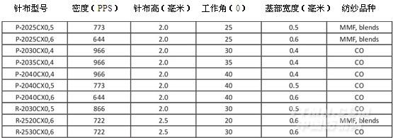 回移的纖維比一般普通針少,因此損傷的纖維少。在精梳機上排除的廢物也相應減少。成品(織物)上的白點的減少證明精梳紗上的棉結的減少,也證明梳棉機應用這種新型針布的極積作用。新型針可以把不成熟纖維、死纖維及結雜排除,并較少損傷纖維,由此使短絨減少。駝峰針布的外形可以在線進行磨針,這是格拉夫-立達已應用的在線磨針技術在駱駝針布的應用的發展。表1為駱駝型金屬針布的型號特征及應用產品。從表中可看出不同的產品配用不同的錫林針布