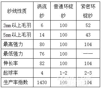4、產(chǎn)品質(zhì)量:渦流紡紗線質(zhì)量特性中,除了紗線強力及伸長率比環(huán)錠紗低以外,其它毛羽,起球率等項質(zhì)量指標勻比環(huán)錠紗好,甚至有些指標還要比緊密紗好。但生產(chǎn)純棉紗質(zhì)量遠不如化纖紗。見表