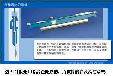 ⑹ 、頂梳針的自我清潔:在生產(chǎn)時(shí)頂梳上含有短纖及雜質(zhì),增加了頂梳的負(fù)荷,以往為此要停機(jī)進(jìn)行清潔,產(chǎn)量會(huì)因此減少。特呂茨勒的TCO1型精梳機(jī)具有自我清潔頂梳的系統(tǒng),非常短暫的壓縮空氣的沖擊波(大約只有毫秒級(jí))對(duì)頂梳針從上到下的進(jìn)行凈化清洗,把附著在針上的纖維及雜質(zhì)去除。清除的頻率可依據(jù)不同的原棉等級(jí)而定。立達(dá)的E65/E75/精梳機(jī) “Ri-Q-TOP”上頂梳上也有高效自我清潔系統(tǒng)。