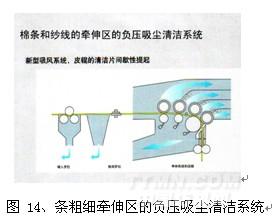 ⑴、像青澤、瑞士及國(guó)產(chǎn)一些新型粗紗機(jī)等都配有負(fù)壓吸塵系統(tǒng),在上下羅拉,皮圈等部分加裝吸風(fēng)口,將這些部位的棉塵,短絨吸走,并在粗紗機(jī)機(jī)尾處配有過濾網(wǎng)箱,使過濾后的清潔空氣循環(huán)回到生產(chǎn)區(qū)。由于采用連續(xù)負(fù)壓吸風(fēng),使?fàn)可旒熬砟硐到y(tǒng)的飛花,短絨及棉塵等都及時(shí)吸走,車間生產(chǎn)區(qū)含塵量很低