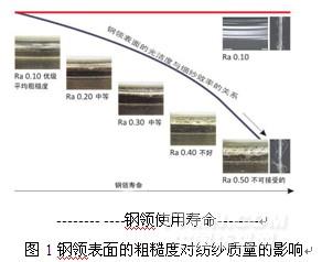 圖中的橫直線表示TITAN鋼領的紡紗質量穩定一致。其它普通鋼領的表面粗糙度不一樣,紡紗質量因鋼領的表面粗糙度增加而下降。特別是紗線的毛羽因鋼領表面粗糙度的增大而增多。而TITAN鋼領的在使用期內紡紗毛羽卻一直穩定。這是TITAN鋼領無可比擬的優點。