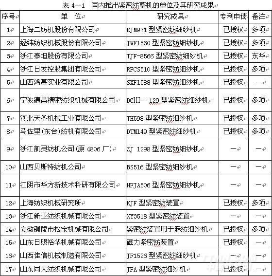 國(guó)內(nèi)業(yè)界廠商在這兩方面都進(jìn)行了一定程度的深入研究。緊密紡整機(jī)的研制單位及其研究成果的具體情況參見表4—1。緊密紡關(guān)鍵件的研制單位、個(gè)人及其研究成果的具體情況參見表4—2(表4— 1、表4—2中的研究?jī)?nèi)容分類并不嚴(yán)格,僅供參考;多項(xiàng)專利申請(qǐng)的“已授權(quán)”包括部分專利申請(qǐng)授權(quán),部分專利申請(qǐng)沒有授權(quán);表4—2中的專利申請(qǐng)基本為實(shí)用新型)。