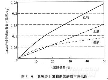漿紗工序中上漿量的減少和退漿工序的減免可顯著降低成本,圖 5—9是立達公司所做的緊密紗上漿和退漿的成本降低圖。