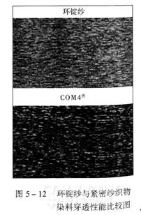在進行免燙整理時,由于高溫高濕,普通環(huán)錠紗的織物強力下降 25%。緊密紗由于結構緊密,強力高,可彌補免燙整理時織物的強力損失(圖5—13)。