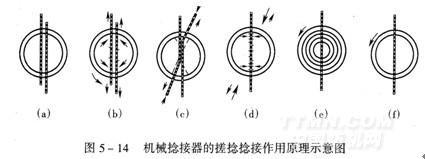 ③讓斷頭的兩根紗線一起進(jìn)入到搓捻盤(pán)的中心位置并合,并把接頭后的過(guò)長(zhǎng)紗頭夾持住[圖5—14(c)];