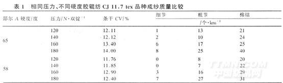 2.3 羅拉加壓不宜過大,一般控制在140 N/雙錠左右,并且加壓要穩定,切勿重加壓,以免膠輥脫殼位移。表1為紡CJ11.7 tex紗,在相同壓力下使用不同硬度膠輥的成紗質量對比。