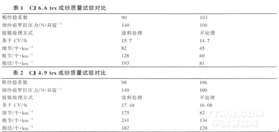 生產(chǎn)過(guò)程中,我們?cè)O(shè)計(jì)兩種工藝,分別在CJ6.6 tex和CJ4.9tex兩品種上試紡,試驗(yàn)結(jié)果分別見(jiàn)表1、表2。