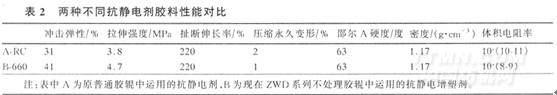由于原抗靜電劑的抗靜電效果差、膠料操作安全性差,所以將抗靜電和增塑劑合二為一。且由于增塑劑的遷移造成膠輥硬度上升、彈性降低,膠輥易老化龜裂;我們選用了高分子量的抗靜電劑,集靜電增塑于一體,使膠料的各項性能明顯得到提高(特別是強度和彈性明顯提高約30個百分點),具體見表2。