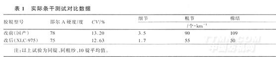 公司在2003年7月中旬,試用一臺車WJ465抗繞表面不處理膠輥,取得良好紡紗效果,于2003年11月中旬推廣應用11臺車,經大面積使用證實,該膠輥成紗質量始終穩定在條干5%水平以內,上車不產生中凹變形,硬度穩定,抗繞性好,回磨周期控制在六個月左右。