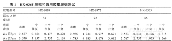 表面粗糙度只9是指物體表面上具有的較小間距和峰谷所組成的微觀幾何特征,紡紗膠輥表面粗糙度即是表面經磨礪后的微觀幾何特征,盡管在控制后加工工藝方面起了一定的作用;但膠輥的配方體系和制造工藝的影響是至關重要的,因此我公司控制了膠輥生產配方的硫化體系和生產工藝,生產的產品具有生產所設汁的、生產加工和使用所要求的表面狀態。HX-0365膠輥和通用膠輥用同一臺磨床和相同的磨礪工藝進行磨礪測試,結果見表1。