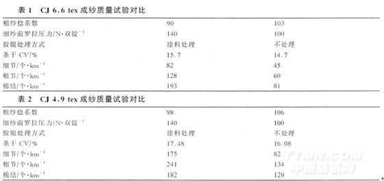 生產過程中,我們設計兩種工藝,分別在CJ6.6 tex和CJ4.9tex兩品種上試紡,試驗結果分別見表1、表2。