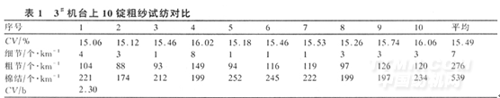 前紡半制品質量尤其是粗紗質量的好壞,對成紗半制品質量具有至關重要的影響;如果粗紗條干不勻,錠間、臺間差異大,將會嚴重惡化成紗條干。我們曾對兩臺粗紗機所紡粗紗進行同錠試紡,其試驗結果見表