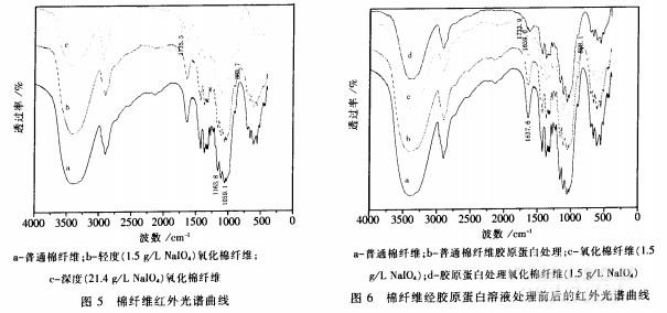 圖5為棉纖維經高碘酸鈉不同程度氧化后的紅外光譜曲線從圖5可以看出,棉纖維經高碘酸鈉輕度氧化后在l733.9cm-1處出現了醛基弱的肩狀吸收峰;深度氧化后,l735.5cm-1處醛基吸收峰增強且變得尖銳,同時,l163.8cm-1,和l059.1cm-1處的羥基特征吸收峰逐漸消失。表明棉纖維葡萄糖環上C2、C3位上的仲羥基被氧化成醛基。另外,深度氧化后883.7cm-1處的半縮醛吸收峰明顯增強,說明隨著氧化程度的加深,氧化生成的醛基與纖維素大分子上普通羥基之間的羥醛縮合也逐漸加強。